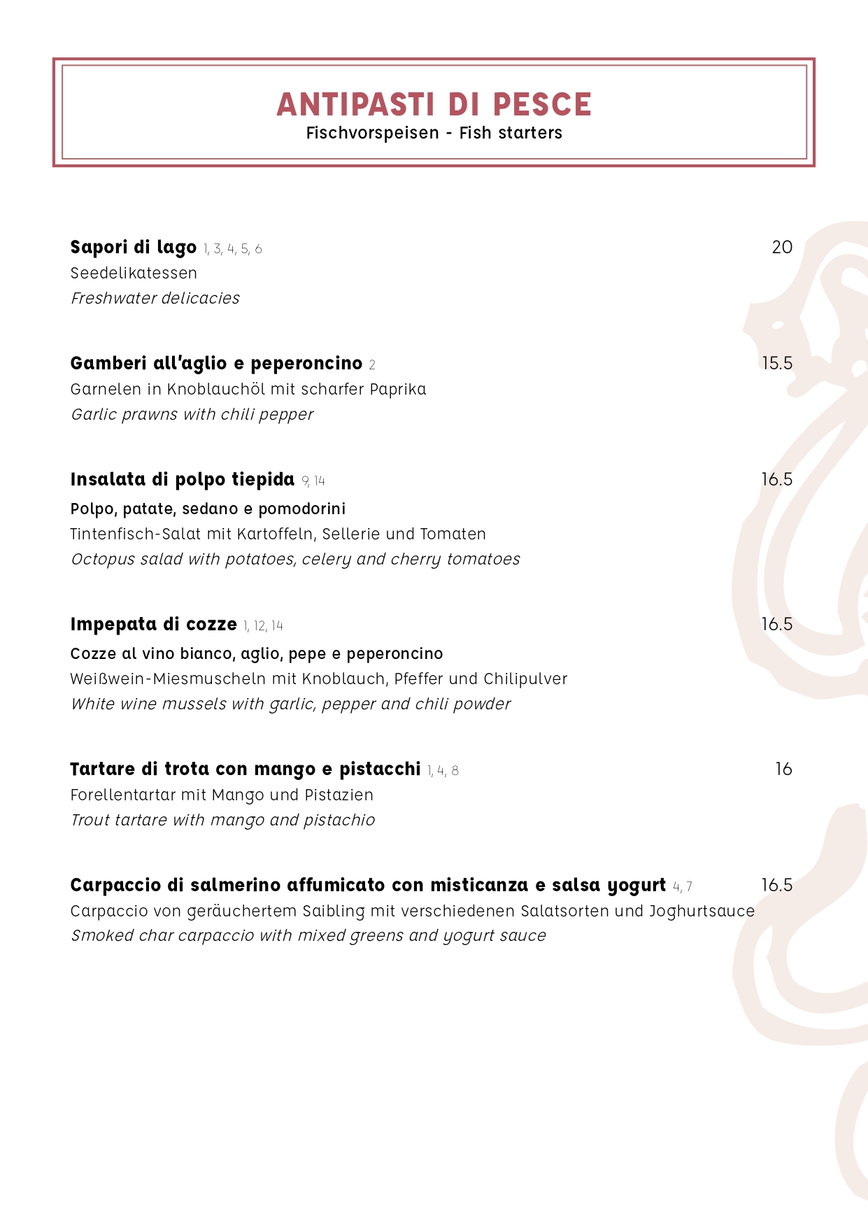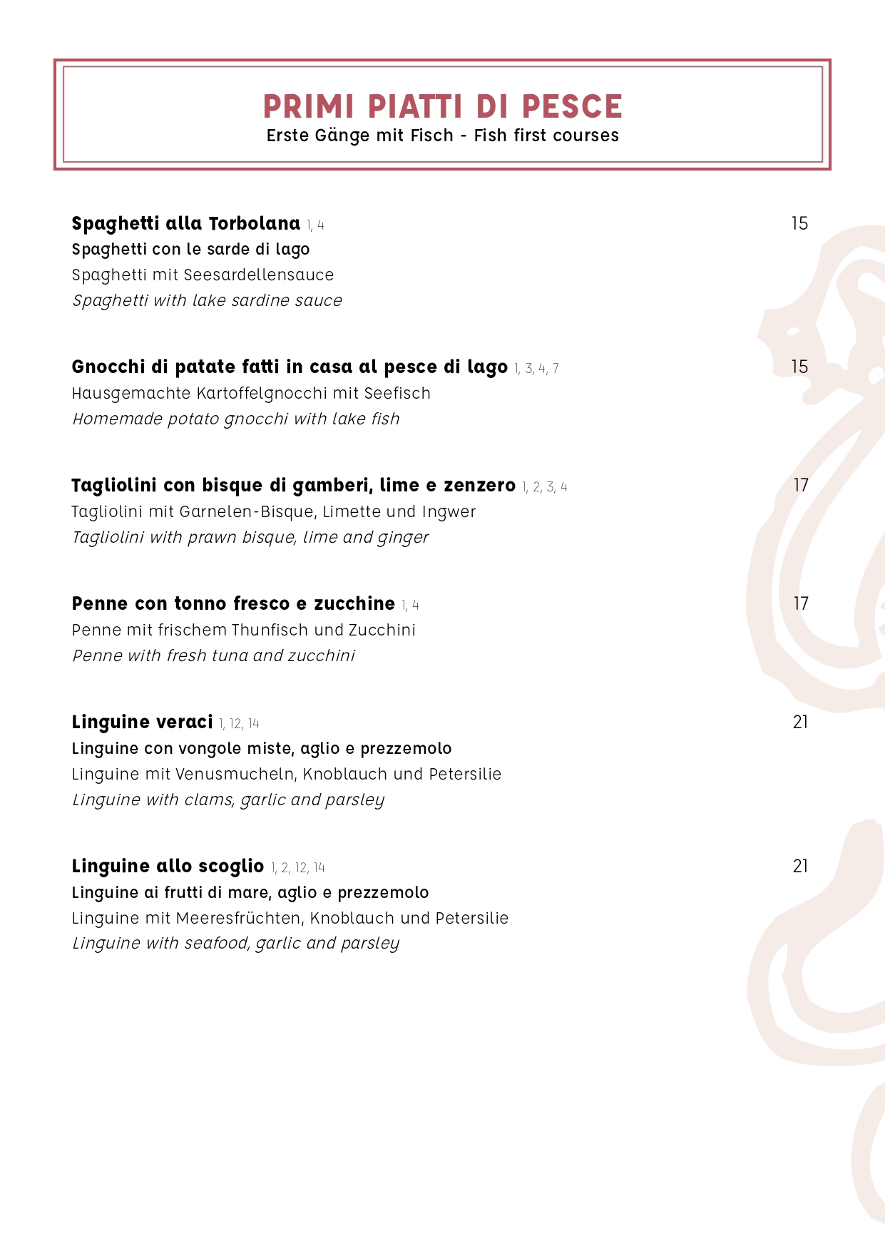 Tra l’ampio ventaglio di piatti tipici della tradizione italiana, viene riservata un’attenzione particolare al pesce di lago, specialità della casa.