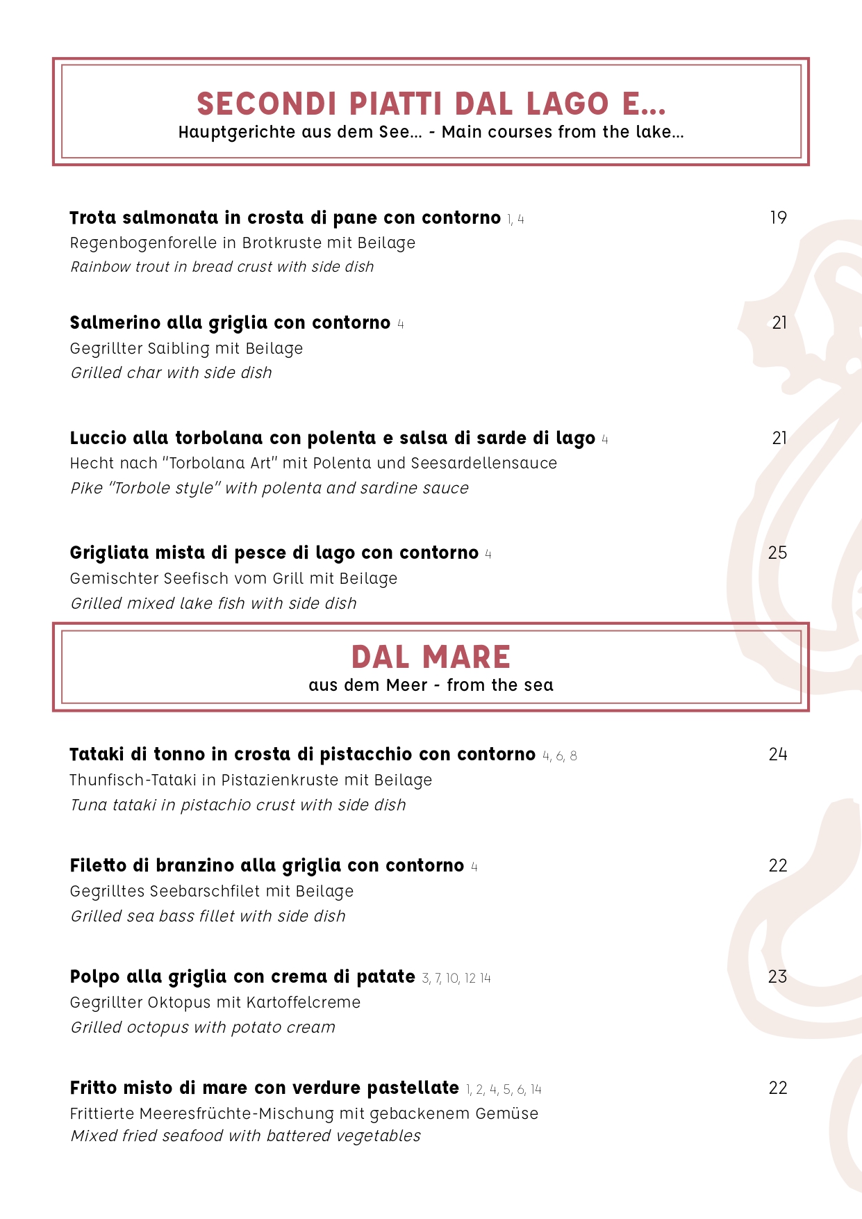 Le più pregiate specialità di pesce di lago vengono declinate dai nostri chef in gustosi antipasti, primi e secondi, rispettando a pieno la tradizione della cucina del lago di Garda.